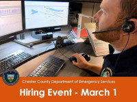 Chester County’s Department of Emergency Services (DES) will be interviewing for 9-1-1 Dispatchers, Safety & Security Operators and a Hazmat Team Responder jobs on March 1. Those interested in a career with DES are strongly encouraged to apply in advance of the event, being held at the Chester County Government Services Center, 601 Westtown Road, West Chester, from 8 a.m. to 6 p.m.