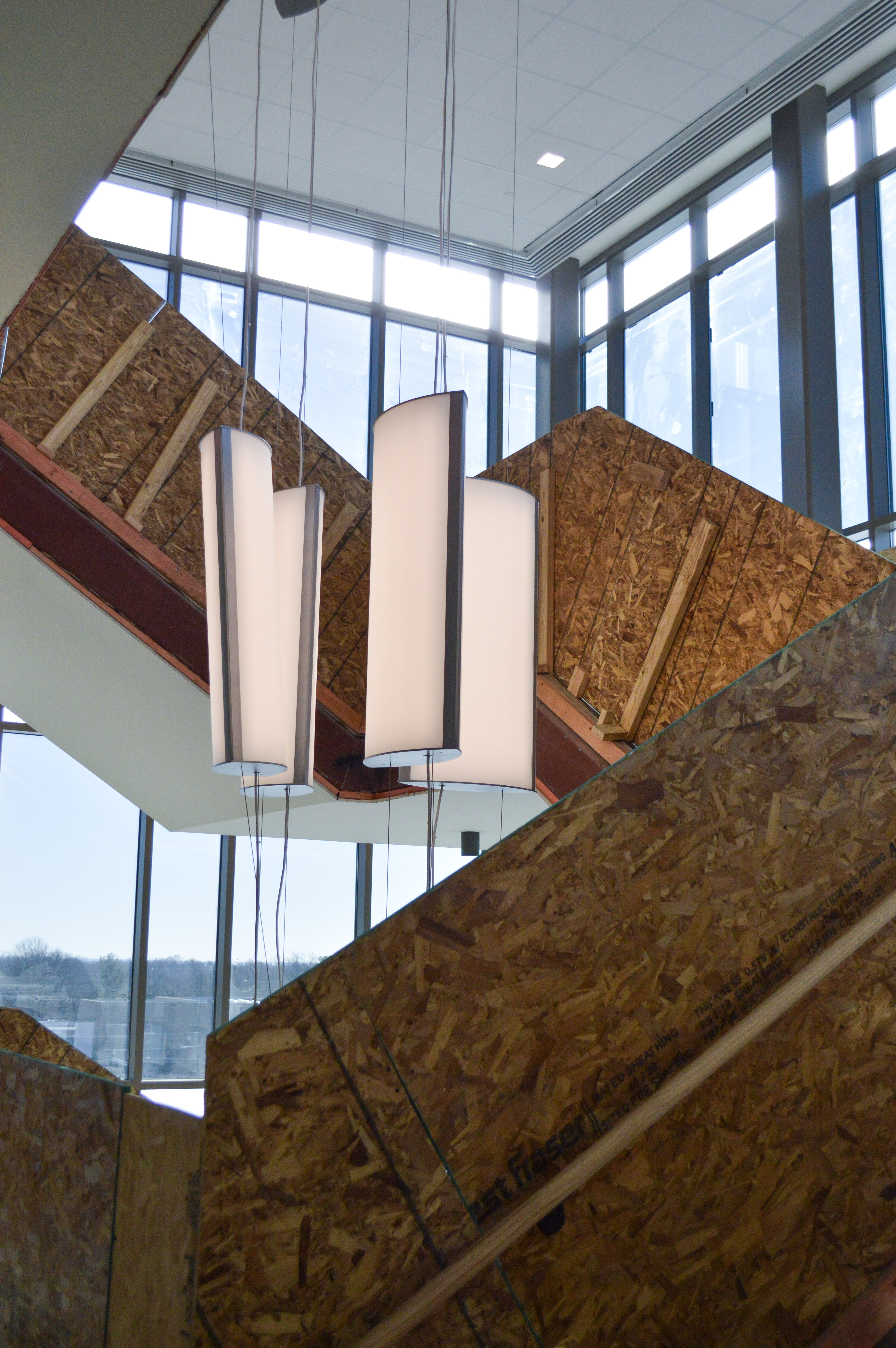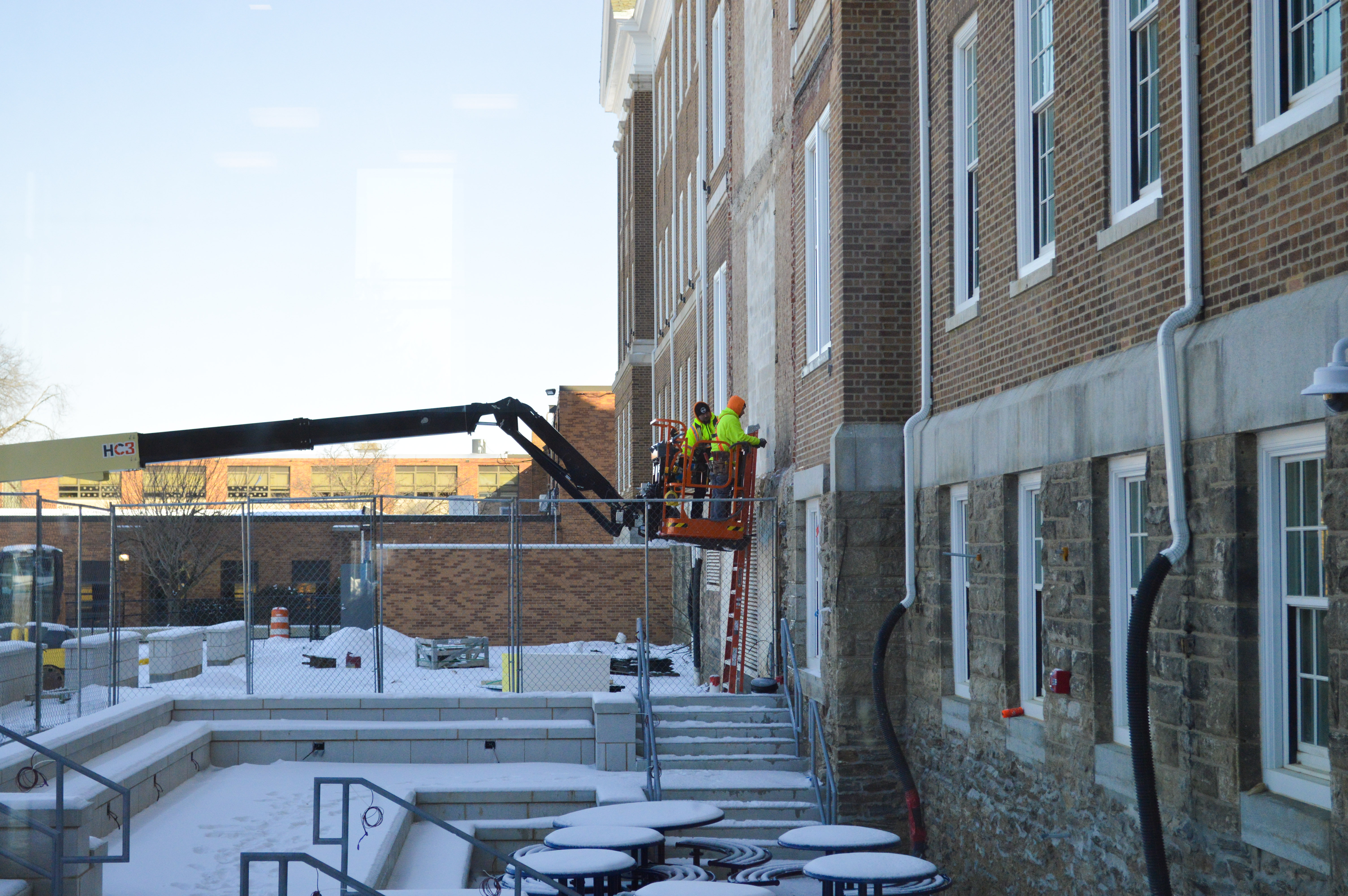 Inside the renovated building, the blending of new architecture with the historical high school has drawn some criticism, specifically regarding doorways where the old and new styles do not mesh seamlessly. The campus is still very much an active construction zone. The main staircase is currently boarded with plywood, tarps block off certain areas, and construction workers are visible throughout the halls during classes.