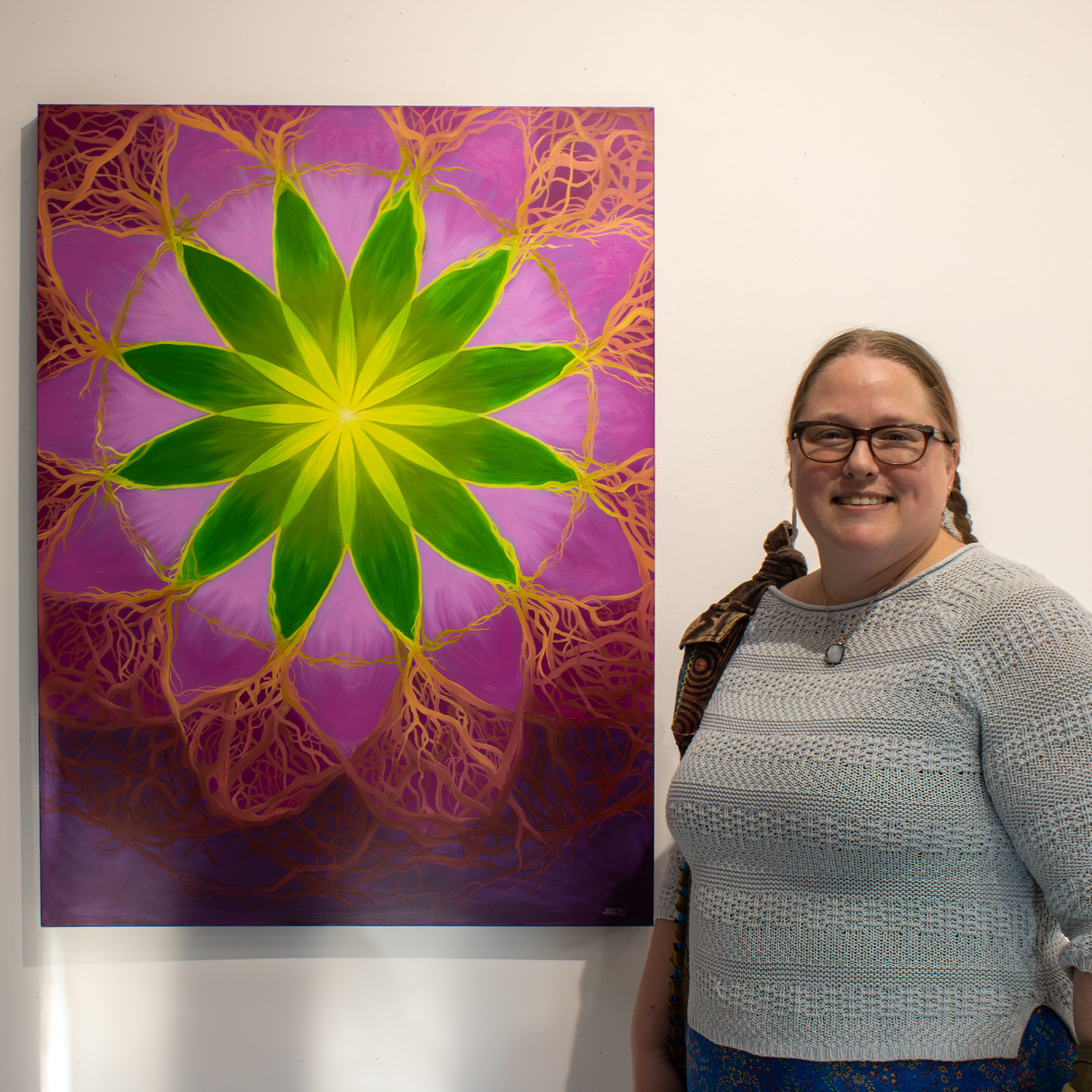 Jen Hintz Eggers utilized the passage of time more literally; her design uses 13 overlapping circles to create a 12-point radiating pattern representing the months of the year. While her work is deeply personal, it connects to the cyclical themes seen throughout the gallery.